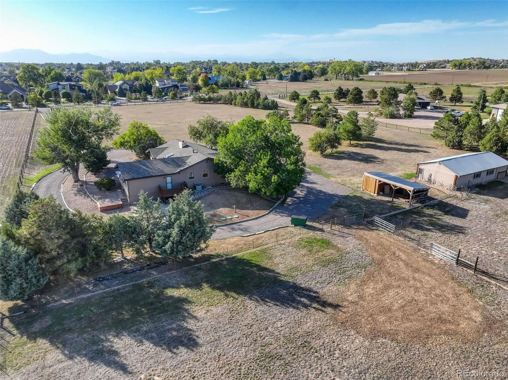 Rare find - Ranch-style home on 4.7 acres in Broomfield! Updated with new Karastan carpet and paint. Light and bright with big windows and a large skylight. Spacious living room with vaulted ceilings. The large kitchen has hardwood floors, plenty of cabinets and counter space, a breakfast bar, and newer stainless-steel appliances. The main floor family room also has hardwood floors, vaulted ceilings, and a dual-sided gas fireplace. The primary suite has an adjoining full bath and walk-in closet. 2 additional bedrooms, a full bath, and the laundry with utility sink complete the main level. The garden-level basement has a 4th bedroom and a spacious multi-purpose family room with a moss rock wood-burning fireplace. There is also an unfinished area next to the utility room that makes a great exercise room. Outside you find 2 decks, one covered off the family room, the other off the garage in addition to a 400 sq ft patio. Zoned A-1, this property is ready for horses or other types of animals with a 47 x 23 ft pole barn, 1/2 of it insulated (R-19) and heated, wired for 220V, hot and cold water, and plumbed for adding a bath. There also is a 2-stall loafing shed with a tack room. The land is set up with 1 large pasture, 2 smaller fenced grazing pastures, and a fenced dog run, in addition to the motorized security entrance gate to the property. Other features include new lighting fixtures, new fireplace doors, a new septic tank and line, a new concrete driveway and garage floor, Anderson replacement windows, an insulated and dry-walled garage, a 4-zone boiler, and a reverse cycle central air conditioning with an electronic air filter. The well has 2 sand filters one UV filter, and a reverse osmosis filter in the kitchen ensuring the purest, high quality drinking water. Come see this rare Property before it disappears.