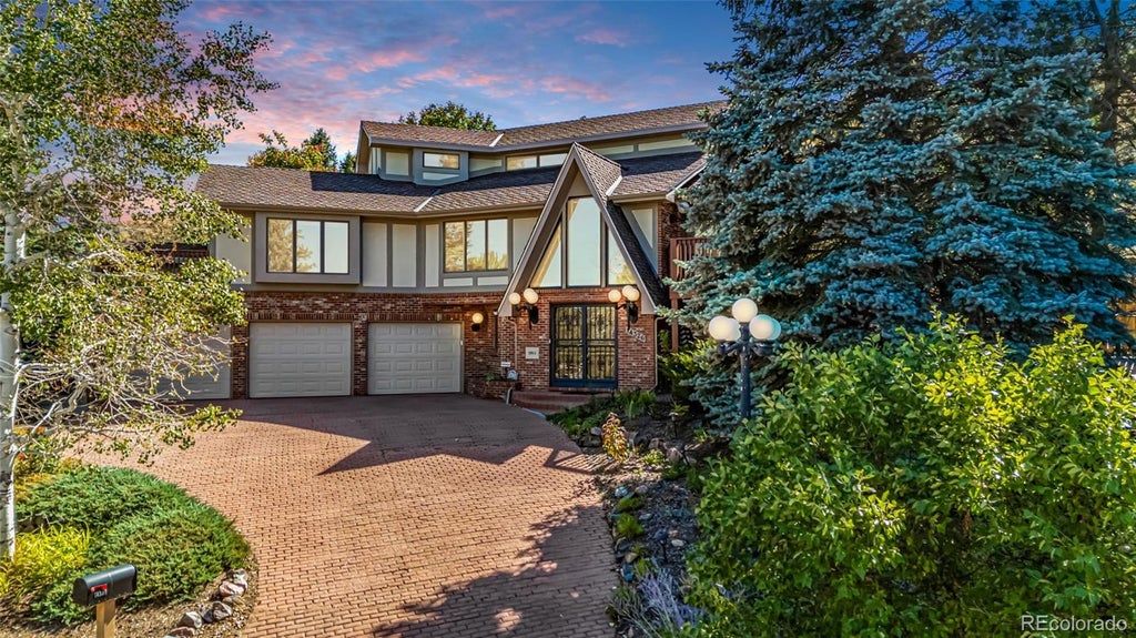Welcome home to this stunning Tudor-style masterpiece backing to Green Mountain, offering privacy and a breathtaking connection to nature. With a hiking trailhead at the end of the street, this property is perfect for outdoor enthusiasts too! The timeless charm of the red brick driveway and exquisite brick-and-stucco exterior is captivating! The front entrance welcomes you with an antique chandelier and custom stained glass, leading to a residence where no expense was spared in design and craftsmanship. Built by a developer for his own family, this home has been expertly maintained and boasts a rarely-found high level of luxury. Inside, the main level features a spacious living room with vaulted ceilings, a wood-burning fireplace, and rich wood box paneling that continues throughout. The dining room showcases intricate curved crown molding, and the well-appointed kitchen offers ample cabinet and countertop space, along with a custom-built unit for additional storage and prep. Relax in the hot tub room or retreat to the luxurious master suite, complete with a private deck offering scenic views. Upstairs, you'll find three generously sized bedrooms, each with mountain views, alongside a full bathroom with double sinks. The expansive backyard is a true fairytale wonderland, featuring multiple pergolas, Canterbury arbors, and charming paths surrounded by lush, professional landscaping. With a roof that's just 5 years old and an exterior water mitigation system, this home offers peace of mind. The oversized 3-car garage features wall-to-wall built-in shelving for additional storage space. Located minutes from grocery, shopping, and entertainment at the shops on Alameda, Union Blvd, and Bel Mar, with easy access to C-470, US-6, and I-70, this exceptionally rare opportunity combines luxury living with a picturesque setting, perfect for your active lifestyle!