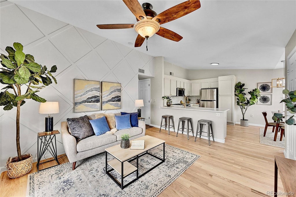Welcome to this bright, spacious, and beautifully updated TOP-FLOOR unit in a sought-after GATED community! Enjoy VAULTED CEILINGS and an abundance of natural light throughout, complemented by an open floor plan and refinished hardwood floors. The custom accent wall adds a touch of elegance, and the entire space has been freshly painted for a modern feel. The kitchen is a chef’s dream, featuring brand-new quartz countertops and stainless steel appliances. The living room boasts a sliding glass door that leads to a large deck – perfect for relaxing or entertaining. The primary suite is a true retreat, with vaulted ceilings, a generous walk-in closet, and a large en suite bathroom with a double vanity and modern updates. The spacious second bedroom is adjacent to a newly updated full bathroom. Additional conveniences include in-unit laundry and a reserved parking space. The HOA includes a clubhouse, fitness center, pool and spa! Located in the heart of Littleton, this home is just a stone's throw from parks, Southwest Plaza, and offers quick access to the mountains. Don’t miss this opportunity to live in a prime location with everything you need just moments away!