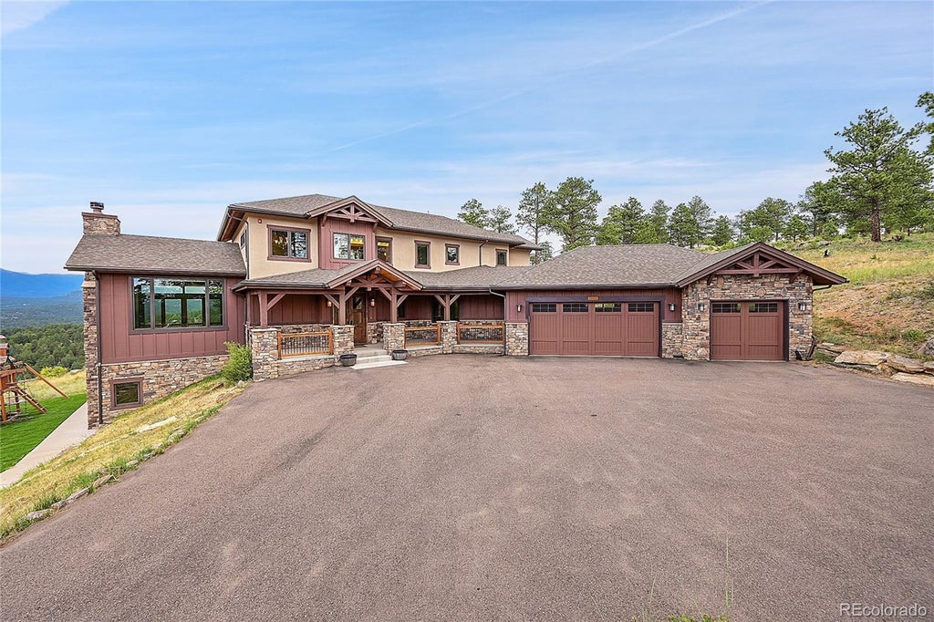 Prepare to be amazed! This stunning 5-bed, 4.5-bath residence, now available for sale, offers both elegance and tranquility. From the moment you arrive, you’ll be captivated by the home’s striking facade with elegant stone accents, a spacious 3-car garage, and a charming front porch. Nestled in a serene setting, this custom home offers a sense of privacy and peace, making it a true sanctuary. Inside, the generous living area features elegant wood flooring, vaulted ceilings with exposed beams, and a cozy fireplace. 8-foot premium solid doors add a touch of luxury throughout. The family room is perfect for relaxation and gatherings. The kitchen boasts 42" wood cabinets, granite countertops, and a stylish tile backsplash, equipped with all the built-in appliances needed for culinary adventures. The serene primary bedroom offers plush carpeting and private balcony access. The ensuite bathroom provides a spa-like retreat with a separate tub and shower, while the spacious walk-in closet ensures ample storage. For peace of mind, the home includes a state-of-the-art fire suppressant system. The backyard is designed for relaxation and entertainment with low-maintenance artificial turf, a patio off the walk-out basement, and a deck to enjoy breathtaking mountain views. This property is a haven for those seeking a retreat with unparalleled vistas and comfort. Conveniently located near Highway 285, this home provides easy access to Colorado’s premier recreation destinations. It’s just 45 minutes to Denver and 90 minutes to ski resorts. What are you waiting for? This remarkable home, offering privacy, serene living, luxurious features, and enhanced safety, won’t last long—act now to make it yours!