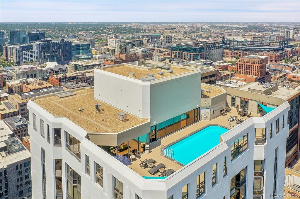 The building is located in the heart of LoDo, right on the 16th Street Pedestrian Mall with the free shuttle to hop on right outside the building connecting you to other areas of downtown, Union Station, and all RTD lines. A car is rarely needed from this location. Whether for your primary or secondary residence, it’s perfect for someone looking for maintenance-free living in a high-rise condominium full of amenities with easy access to everything you need: health care, airport, Colorado sport teams, shopping (including grocery stores and Target), dining, and entertainment! . This corner unit floods with natural light from the floor to ceiling windows and overlooks the beautifully landscaped outdoor plaza for a rare greenspace view within the city center. The open concept kitchen and living room is great for entertaining with two large bedrooms, two full bathrooms, and plenty of closet space with all built-in storage. This unit comes with a reserved parking spot in the attached garage and a large storage locker. The HOA includes water, sewer ,trash, gas, heat, insurance, high speed internet, cable TV, coin operated laundry, structure and ground maintenance, elevators, reserved garage parking, plus tons of amenities. The superior amenities include two outdoor spaces: a rooftop pool and a plaza with grills, firepit, community garden, and secluded pergola areas separated by fully grown landscaping for added privacy. Amenities also include 24-hour concierge; fitness center; secure bike storage; Luxer One locker system for packages; and a Sundeck Lounge with sweeping views of the mountains, full kitchen and oversized flat screen TV that is perfect for parties, meetings, and game night..... This unit can be sold fully furnished. All furniture is for sale at an additional cost.