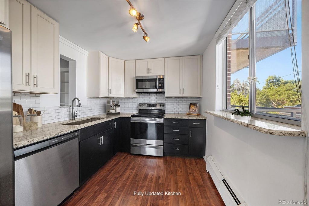 Totally renovated condo in quiet building, located just two blocks west of Cheesman Park. This spacious one-bedroom, one-bathroom unit is ready for you to move in and enjoy the accessible neighborhood. This unit has been through a full remodel, including the updated kitchens with gorgeous two-tone cabinets that are soft close, stainless steel appliances, granite countertops, a pantry, and an abundance of cabinet storage. There is even room for a dining table in the kitchen area Entering the unit, you will find a large storage closet with room for all of your Colorado outdoor gear and day to day living needs. A remodeled bathroom with tile floors, tile shower, and an extra linen closet is located on the way to the spacious bedroom which boasts a full wall of closet space. The living room offers built-in shelving, perfect for displaying your favorite plants and books. The unit is full of natural light from the large windows, and two huge sliding glass doors giving access to your two private oversized balconies. Two brand new AC units keep the space cool and comfortable during the warm summer months. Residents enjoy access to a common area laundry center featuring digital pay washers and dryers and a common rooftop area, ideal for relaxing or entertaining with stunning views of downtown Denver and the Rocky Mountains. An additional storage unit is deeded with the unit, perfect for keeping those bulking items out of your living space. Don’t miss this opportunity to own a bright and modern condo in one of Denver’s most desirable neighborhoods. Schedule your showing today to see this wonderful space and experience the perfect blend of comfort and convenience at 909 Lafayette Street #304.