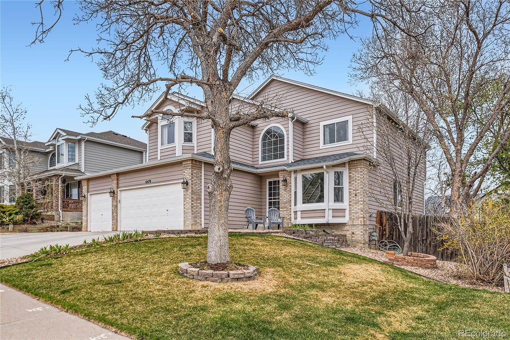 Welcome to Woodbury Hills in the coveted Powderhorn community. This home features a 3-car garage and the popular floorplan with one main level bedroom and three bedrooms on the upper level. Generous space for relaxing or entertaining on the main level. Two-story entry foyer with generous natural light flows easily into the formal living room and dining room space with west-facing bay window. Updated kitchen features wood flooring, granite counters, desk area, walk-in pantry, and bar seating at both the island and at extended counter space. Two-story family room features 3 large windows with transom windows above bringing in generous natural light. Gas fireplace and built-ins. Main floor bedroom/study and half bath plus main floor laundry. Primary bedroom features walk-in closet and 5-piece bath. Solid wood doors throughout. Fully fenced back yard with patio area. Unfinished basement for storage and/or finishing with three egress windows. Newer roof and some updated windows. Fabulous location with close proximity to Chatfield Reservoir, Lily Gulch Rec Center, Meadows Golf Club, and The Ridge Recreation Center with shopping and restaurants near by.