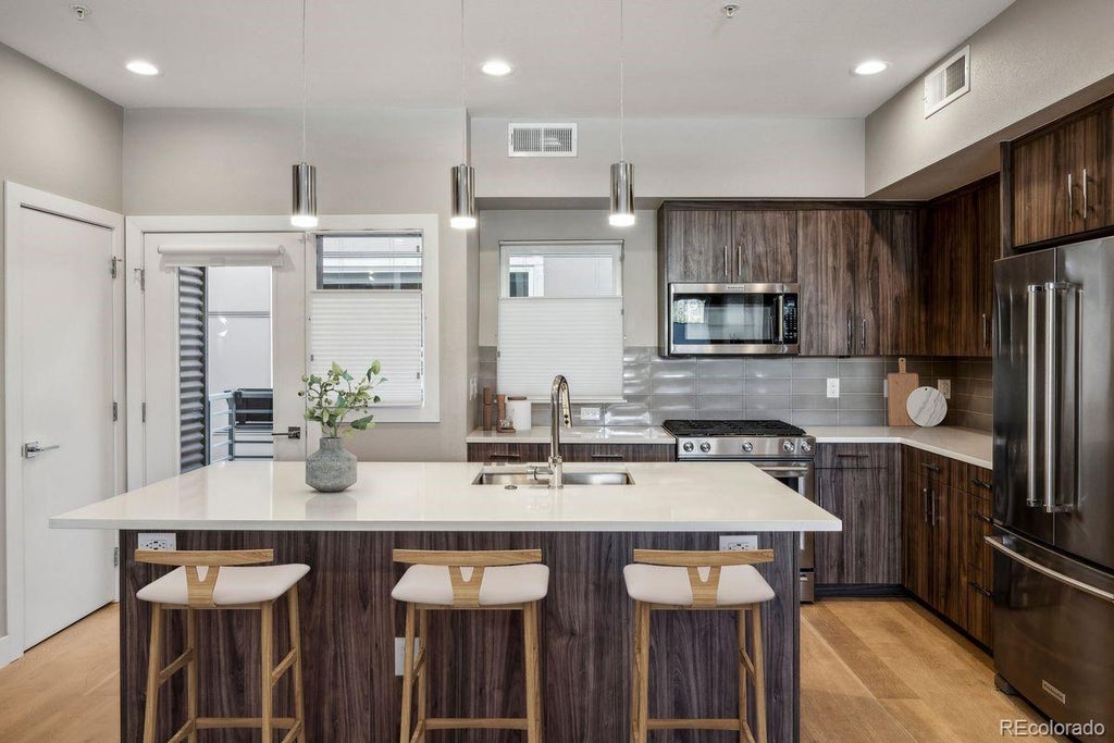 Welcome to your dream townhome in the sought-after Berkeley neighborhood of Denver! Original owner, built in 2019, this stunning residence features gorgeous light vinyl plank flooring on the entry level and wood plank flooring on the second level, complemented by a sleek horizontal metal bar railing and elegant wood stairs. You’ll appreciate the entry space, with coat closet, convenient half bath, and laundry space. There's even a small alcove for a work at home desk. Head up to the open-concept main level which flows seamlessly between the kitchen, dining, and living areas, making it perfect for entertaining. The kitchen boasts a large island, quartz countertops, KitchenAid stainless steel appliances, a walk-in pantry and access to an outdoor balcony - ideal for grilling. Custom window coverings to keep the sunshine in or out! The third level is dedicated to relaxation, featuring a luxurious primary bedroom suite complete with a walk-in closet. The primary bathroom offers a large shower, dual vanities, and a private water closet for added convenience. Down the hall, you’ll find a full bath and a cozy guest bedroom. Custom California closet organizers in both bedrooms! Ascend to the fourth level, where a true gem awaits: a private rooftop space offering rare, unobstructed views of the mountains—perfect for morning coffee or sunset gatherings. With a one-car attached heated garage and just a couple of blocks from all that Berkeley has to offer—restaurants, parks, retail, and coffee shops—this townhome perfectly combines modern living with an unbeatable location. Don’t miss your chance to call this beautiful property home!
