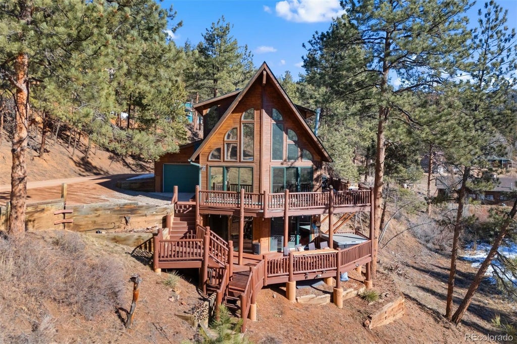 Tucked along the banks of Trout Creek in the Rainbow Falls gated community, this two-acre retreat offers a blend of natural beauty and modern comfort. With the soothing sounds of the river and the sight of five cascading waterfalls, this property immerses you in serenity. A gazebo and riverside firepit provide idyllic spots to enjoy the outdoors, while expansive wraparound decks invite you to take in the views from every angle. Inside, floor-to-ceiling windows frame the lush surroundings, bringing the outdoors in. The primary suite features a private deck overlooking the creek, while the lower level is designed for fun with a pool table, gaming area, and full bar. Whether you’re hosting friends or seeking quiet moments in nature, this home delivers both. Just 20 minutes from Woodland Park and a short drive to Deckers, it combines seclusion with convenience, making it the ultimate mountain retreat.