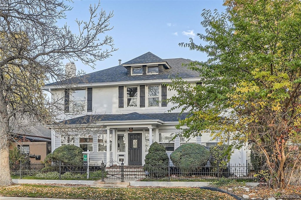 This meticulously restored Denver Square half-duplex blends timeless elegance with the enchanting allure of French New Orleans-inspired details. From the moment you arrive, the home makes a lasting impression with its ornate wrought-iron front yard fence, a shared atrium entryway providing superior sound isolation, and a charming lattice-covered walkway leading to the backyard gate. Step inside, and the foyer greets you with stunning period details: custom tin-covered 9' ceilings, intricate crown & cove molding, antique checkered and mosaic tile floors, original fir and oak hardwoods, and beautifully refinished brass hardware. The inviting living room, centered around a striking gas fireplace and custom built-ins, seamlessly flows into the formal dining room, complete with rich wainscoting, a period chandelier, and recessed lighting set within exquisite crown molding. Just off the dining room, a hallway bar with plumbing and ample glass-front cabinetry provides the perfect spot to showcase glassware and spirits. Toward the back of the home, a chic retro-style kitchen offers both function and flair. It’s equipped with an imported Heartland vintage replica gas stove and stainless-steel refrigerator. The 2nd floor features two well-appointed bedrooms, two full bathrooms, and a study with custom built-in bookcases/3rd BD. The primary suite is a true retreat, featuring a spa-like bath with skylights, a claw-foot tub, a spacious double-headed walk-in shower, a pedestal sink, and a bidet. A cozy gas fireplace, a lockable walk-in closet with ELFA storage. Just outside the primary suite, a shared grand sunroom awaits—a serene space with ceiling fans, and skylights, ideal for relaxation. Located in the heart of central Denver, only one block from the vibrant South Broadway district, this home offers a rare combination of historic charm and modern convenience. Enjoy easy access to some of the city’s best dining, shopping, and entertainment, making this an unbeatable location.