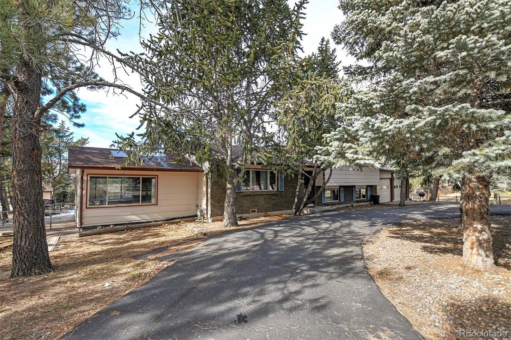 VIEWS!! Incredible Opportunity in this D20 distressed property on an acre with attached AND detached garage in wonderful Falcon Estates. AND THE VIEWS!! Attached Sun room with hot tub, brick flooring, skylights and VIEWS is not part of the home's square footage! Koi pond and paths still have expensive perennials, and could be restored to its former glory! Three bedrooms up and one down off of walk out family room with brick wood burning fireplace. 2023 roof with leaf guards. Mature trees and shrubs. This hidden gem of a quiet friendly neighborhood with homes on acreage is conveniently located just northeast of Woodmen and Academy, was formerly horse property. Property is being sold As-Is Where-Is. Fix and flip or work on a dream home!