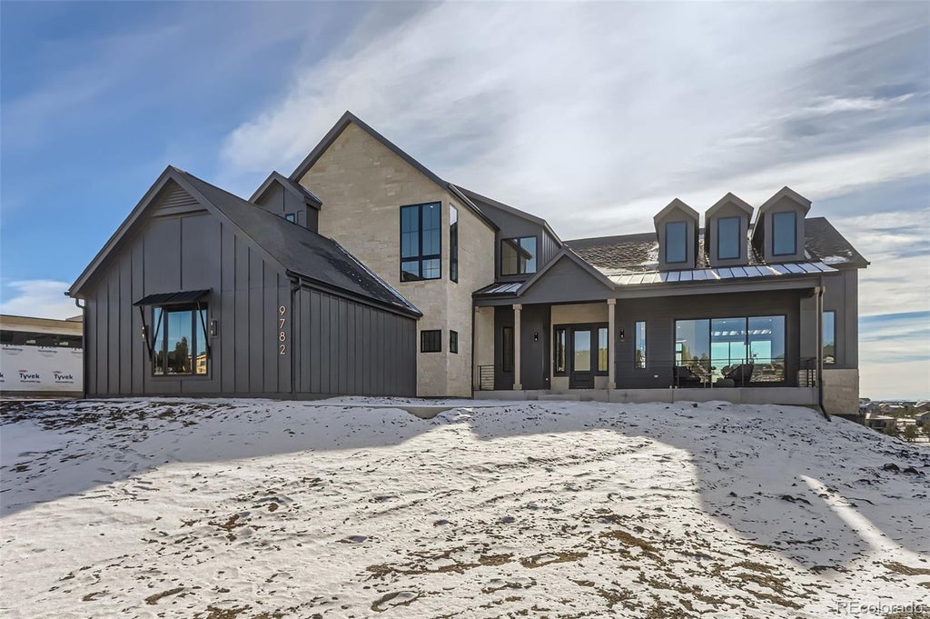 Welcome to 9782 Majestic Oak Drive-a stunning Mountain Modern two-story home in the sought-after Timbers at the Pinery Community. Perched atop one of the marque home sites, this luxurious property offers 6,049 finished square feet of finished living space, plus an additional 995 square feet of unfinished space, perfect for future customization. Key features include: 5 bedrooms, including a main-floor Owner's Suite with vaulted ceiling and spa-like en-suite bath (w/his and hers water closets!); 6 bathrooms (4 full, 2 half); Gourmet kitchen with quartz countertops, soft-close Maple cabinetry, and Thermador appliances with Home Connect technology; Open-concept design with 12-foot ceilings and a 62-inch Vector fireplace in the great room; Main-level office with deck access and mountain views; Covered composite deck with Cool Technology; .52 acre lot with panoramic mountain views!!; State-of-the-art technology: pre-wired surround sound, outdoor speakers, Google-enabled doorbell, and WiFi-enabled garage doors with cameras; Four-car garage with EV charger; Dual-zone HVAC system with four smart thermostats; Architectural shingles and SmartStrand siding for durability and low maintenance; Oversized windows showcasing MASSIVE mountain views; Home gym and two finished storage rooms; Main-level AND upper level laundry rooms. This home seamlessly blends modern comfort with sophisticated design, offering a perfect balance of luxury and practicality. The open layout, high-end finishes, and smart home features create an ideal living space for those who appreciate style and efficiency. With its spacious interiors and stunning outdoor areas, this property is perfect for both everyday living and entertaining. All of this located in the Timbers!...Enjoy miles of trails, acres of open space, access to The Pinery CC-and the occasional visit from our neighborhood deer! This home has it all! Schedule your private tour today to experience this exceptional home by award winning Joyce Homes!