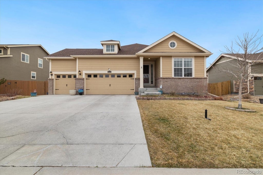 WOW! Exceptional Ranch with Incredible Finished Basement & Rare 4-Car Garage! This meticulously maintained 4-bed, 4-bath Lennar Springdale model offers a spacious, open layout with designer touches throughout. The inviting foyer leads to a gourmet kitchen with expanded cabinetry, a large island, huge pantry, and updated stainless appliances, flowing into the great room with a gas fireplace. A main-floor office with 9' French doors, mudroom, and separate laundry room add convenience. The primary suite features coffered ceilings, a luxurious bath, and sizable walk-in closet. The finished basement is the best you will see! It's built for entertaining with a huge family room, wet bar with cabinetry & fridge, plus a guest room & a 3/4 spa-like bath and walk-in steam shower. It also offers a flex space that is perfect for a home gym, playroom, or second office, with ample storage as well. Enjoy Colorado outdoor living on the covered Trex deck, extended patio, and beautifully landscaped yard. The rare 4-car garage offers space for vehicles, toys, or hobbies. Additional special touches include custom paint, barn door in primary, statement walls, wainscoting, radon mitigation, solar, floor to ceiling stone fireplace surround,**2 sheds and more. Located in Orchard Farms, with a 5-acre park, playground, pavilion, and tennis courts, plus easy access to Denver, DIA, and Orchard Town Center. A must-see—schedule your tour today!