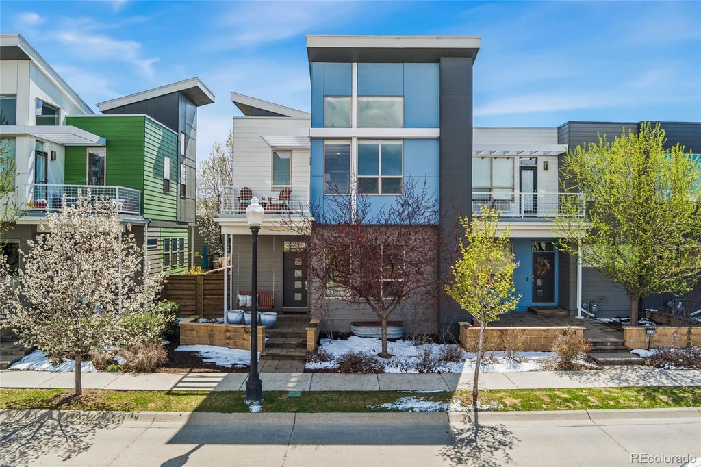 Experience the ultimate in urban living with this beautifully updated modern townhome, perfectly positioned directly across from Central Park. Enjoy idyllic mornings on the charming front porch swing, taking in the scenic park views. Step inside to an open and inviting main living area where the kitchen, dining, and living spaces flow seamlessly. The recently updated kitchen features exquisite Taj Mahal leathered quartzite countertops with a waterfall island, a top-of-the-line Brizo faucet, a composite sink, and elegant new light fixtures. The dining area opens to a private patio, creating the perfect indoor-outdoor living experience. A spacious main-floor office with built-in desk and shelving, along with a stylish half-bath, completes this level. Upstairs, the luxurious primary suite boasts vaulted ceilings, mountain views, a private balcony, and automated/motorized shades. A mini-split system in this room ensures personalized climate control. The spa-like 5-piece en-suite bath and an oversized walk-in closet add to the retreat-like feel. Find two additional bedrooms upstairs, one with high ceilings and built-in shelving, while the other offers a private en-suite. A large laundry room with Elfa shelving on the upper floor adds everyday convenience. The fully finished basement is an entertainer’s dream, featuring a full bar with high-end appliances, a kegerator, and an entertainment area with a pool table and custom-built storage. A guest bedroom and full bath complete the lower level. Outside, the low-maintenance fenced backyard is a private retreat, featuring newer turf, a drip line for plants, and lush perennials. The detached 2.5-car garage offers incredible storage with vaulted ceilings and a Flow Wall organization system. Located in a vibrant community with frequent events and an unbeatable location close to FlyteCo, Stanley, and the Town Square, this home offers a rare blend of modern luxury, thoughtful updates, and effortless convenience!