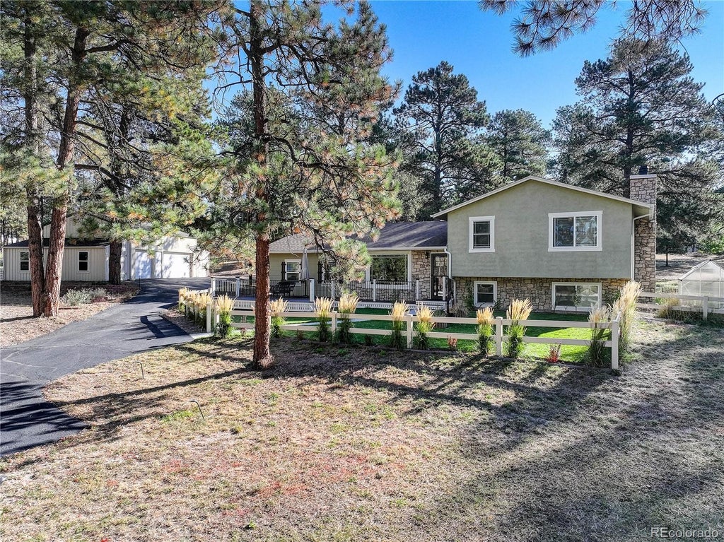 Amazing, secluded home close to town. Surrounded by ponderosa pines, this beautiful and serene home sits nestled in privacy amongst the natural wildlife that is Colorado! The home is fully remodeled, including all four bathrooms, and the spacious kitchen features maple cabinetry and stainless appliances. A main floor primary suite with large walk-in closet is complimented by four additional bedrooms and three bathrooms. The family room welcomes you with a stone surround fireplace, and also features a custom-built workstation area. A new roof was installed in June 2024. Outside there are inviting patios, both front and rear, that are perfect for entertaining. With a 2.25-acre lot, options for usage and fun are endless! In terms of parking, there is a detached two car garage, but the real bonus is the additional workshop/garage featuring 3 bays, 2 overhead doors, 220 volt, pellet stove, built-in work benches and additional storage space, totaling over 1100 sq ft. An incredible space for any hobbyist! Just minutes' walk from town, this incredible home offers all of the Colorado dream in just one place!