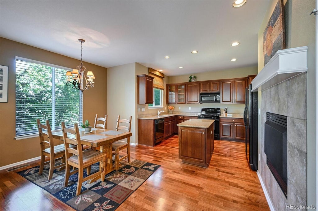 The Hearth/Highlands Ranch Subdivision, 2-Story Home, Lot sq ft: 3,833, built in 2006,1,744 Sq ft, 848 Sq ft finished basement, 3 bedrooms plus a loft, Den/study on the main level, third bedroom in the basement & 4 bathrooms: primary upstairs 5-piece suite and full bathroom, main level ½ and ¾ bathroom in the basement. Builder is Shea Home, model Shenandoah with Elevation C & faces SE. This home offers its welcoming entry way & eye-catching stairway. The basement has bedroom while upstairs you’ll enjoy a fabulous bonus room (loft), cozy tech center, generous second bedroom with ensuite bathroom & well-appointed primary bedroom with a 5-piece bathroom. Here styling meets innovation for a perfect fit! The main kitchen counters are Golden Garnet Slab Granite, full Bullnose, Undermount cast iron double Kitchen sink, breakfast nook, Satin Nickel Hardware on all kitchen 36” Cherry wood w/ cherry/paprika cabinet & concealed hinges, Crown molding & a few glass cabinets fronts. Refrigerator w/water dispenser & water line for icemaker, 4-burner gas range, microwave, dishwasher, fireplace Taupe with 13 x 13 ceramic surround tile, & mantel, large pantry. All cabinets throughout the home are Cherry wood w/cherry/paprika. Back Yard & Deck: Professional landscaped, Custom large Trex Deck w/ black iron railing, Fence: 4-foot split rail on the sides and the back is a 6-foot privacy fence, pebble gravel walkway on the side of the home, window grades for egress outside window. Improvements throughout the home: New furnace installed 10-2024, Painting all the exterior home in 2022, Roof replaced in 2024, 2022 gas water heater, 2 car Garage & Overhead Storage, Hunter Douglas wood blinds throughout, low E dual pane white vinyl windows, James Hardie fiber cerement board siding. Close to C-470, I-25, grocery stores, shopping centers, dining, amazing mountain biking/hiking trails. Plus, Highlands Ranch Rec centers. Welcome to your new home!