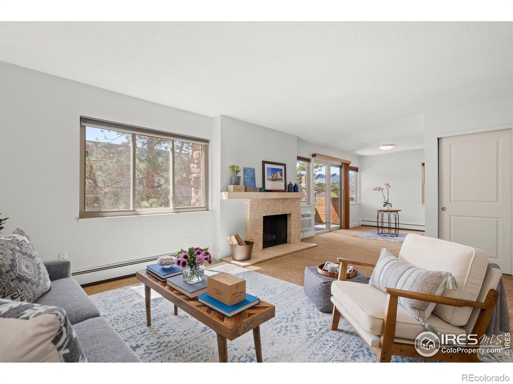 Well-maintained and beautifully redone, this 2 BDRM end unit offers a blend of modern style and easy living. Ready for you to move in and enjoy an open, bright interior with plenty of natural sunlight and a charming balcony to breathe in the Colorado air. The kitchen features attractive hickory cabinets, wood floors and a new dishwasher resized for better functionality and upgraded electrical panel. Originally two baths converted into one spacious full bathroom with modern tile flooring, sleek gray shower tile, and a chic vanity featuring a marble countertop with wood cabinetry. Cozy up by the fireplace or step out onto the shaded balcony for relaxation. Nestled among the trees in the middle of the complex away from streets, this quiet corner unit offers lovely views. Conveniences include extra parking with assigned covered space and additional storage right out the door plus laundry room steps away in the same building or utilize the plumbing for stackable W/D unit. Easy access to major roads, bike lanes and bus routes to appreciate the best of Boulder life! Enjoy peaceful strolls through this quiet, tree-lined community and take advantage of on-site amenities like the tennis/pickleball court, community center w/kitchen, pool table, indoor salt water pool and sauna! Ideal for an active lifestyle or great investment. Call for lending options and schedule a showing TODAY!