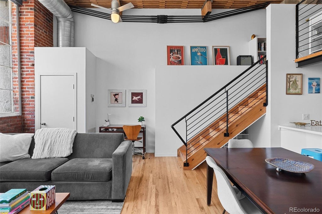 Welcome to this exceptional two-story, one-bedroom, one-bathroom loft nestled in the heart of Denver’s Golden Triangle. Blending modern luxury with historic charm, this thoughtfully remodeled residence is located in the iconic Cadillac Lofts— once home to the Cadillac Motor Company service garage. The home showcases original hardwood floors, soaring 15-foot ceilings, and exposed brick walls, preserving the character of its industrial roots while offering contemporary comfort. Oversized windows flood the space with natural light and frame stunning views of the Denver skyline from every room. A benefit is also the electric privacy and blackout curtains installed for each window. This stylish condo boasts a unique blend of character and comfort, starting with soaring wood-paneled ceilings in both the kitchen and bathroom that add warmth and texture to the space. The open-concept main level features an updated kitchen with bar stool seating at the island, ample room for a dining area, and a spacious living room perfect for entertaining. Upstairs, the lofted bedroom offers privacy while still enjoying the unit’s high ceilings and open layout. Additional highlights include updated appliances within last 5 years, new HVAC in past 5 years, Smart thermostat with heat sensors, in-unit laundry, deeded parking with an adjacent storage unit, and sleek laminate and wood flooring throughout. Take advantage of the building’s amenities, including bike storage, secure entry, and an EV charging station. Building is currently remodeling the Community Rooftop Deck upon completion you will be able to enjoy Rooftop BBQs with mountain and city views. Located in the heart of the Golden Triangle, you’re just steps away from museums, art galleries, Civic Center Park, Cherry Creek Trail, and some of the city’s best restaurants, cafes, and cultural attractions. With easy access to public transit and major highways, this condo offers both convenience and urban living at its finest.