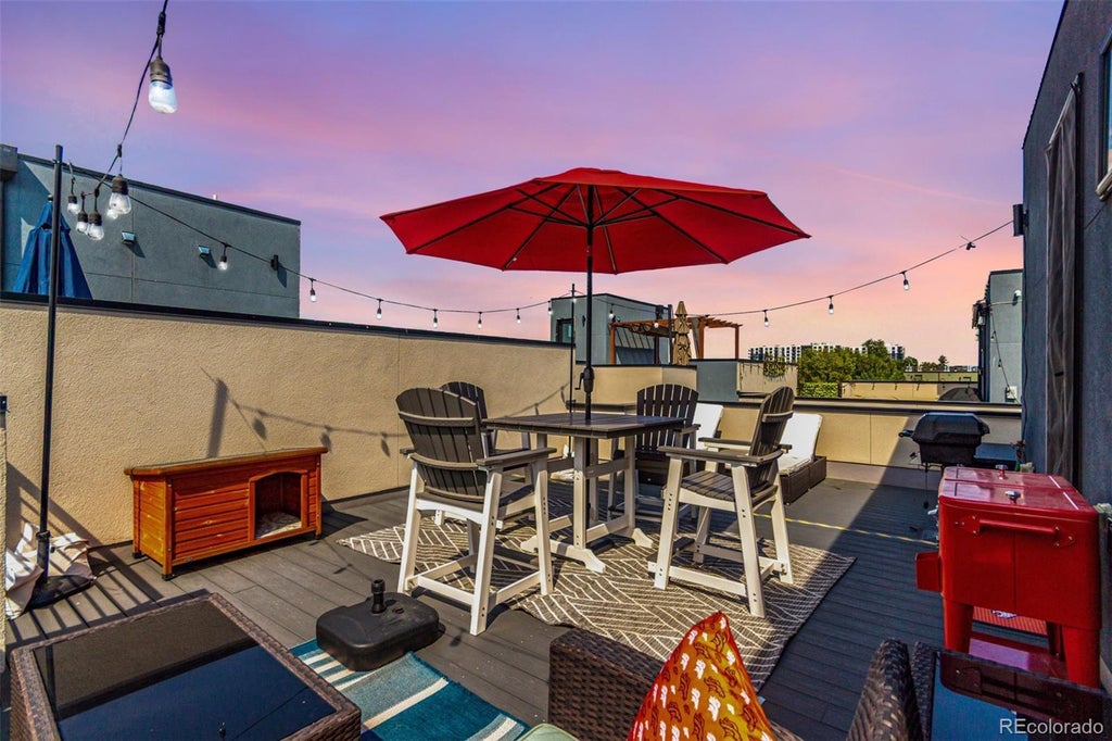 Sophisticated Urban Contemporary Townhome in Highly Coveted Jefferson Park. Nestled in the heart of one of Denver’s most walkable and vibrant neighborhoods, this elegant multi-level townhouse offers the perfect blend of modern luxury and everyday comfort. Located in highly sought-after Jefferson Park, you’ll enjoy effortless access to trendy restaurants, boutique shops, lush green spaces, and downtown Denver—all just minutes from your door. Step inside to find a thoughtfully designed interior featuring durable tile flooring, a convenient half bath, wood stairs, and a calming neutral palette. The open-concept main level is bright and inviting, enhanced by plantation shutters, recessed lighting, and thick baseboards that add a polished touch. The stylish kitchen is a true showstopper, complete with stainless steel appliances, sleek white cabinetry, quartz countertops, a designer tile backsplash, and a generous island with breakfast bar—perfect for casual meals or entertaining guests. Upstairs, you’ll find two spacious bedrooms, each with its own private en-suite bathroom, plush carpeting, and a convenient stacked laundry area nearby. Cap off your day on the exquisite rooftop deck, where breathtaking city skyline views set the scene for relaxing mornings or unforgettable sunset gatherings. A 2-car garage provides plenty of room for your vehicles and extra storage. With designer finishes throughout and an unbeatable location in one of Denver’s most desirable neighborhoods, this stunning home truly has it all.